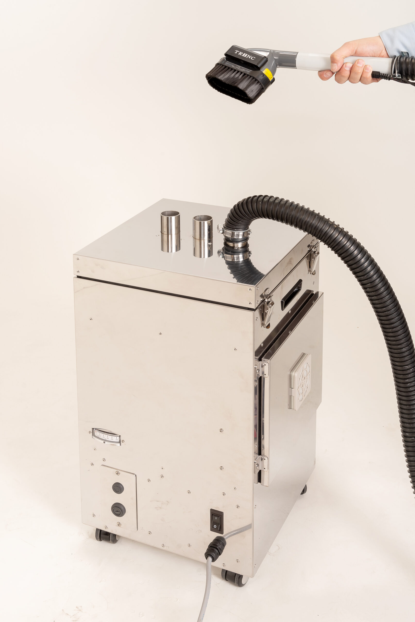 小型なのに高静圧仕様で強力吸塵。長く細いダクトホースでも吸引力を維持し、静電気除去機「バキュームクリーナートリンク」の接続使用に最適です。